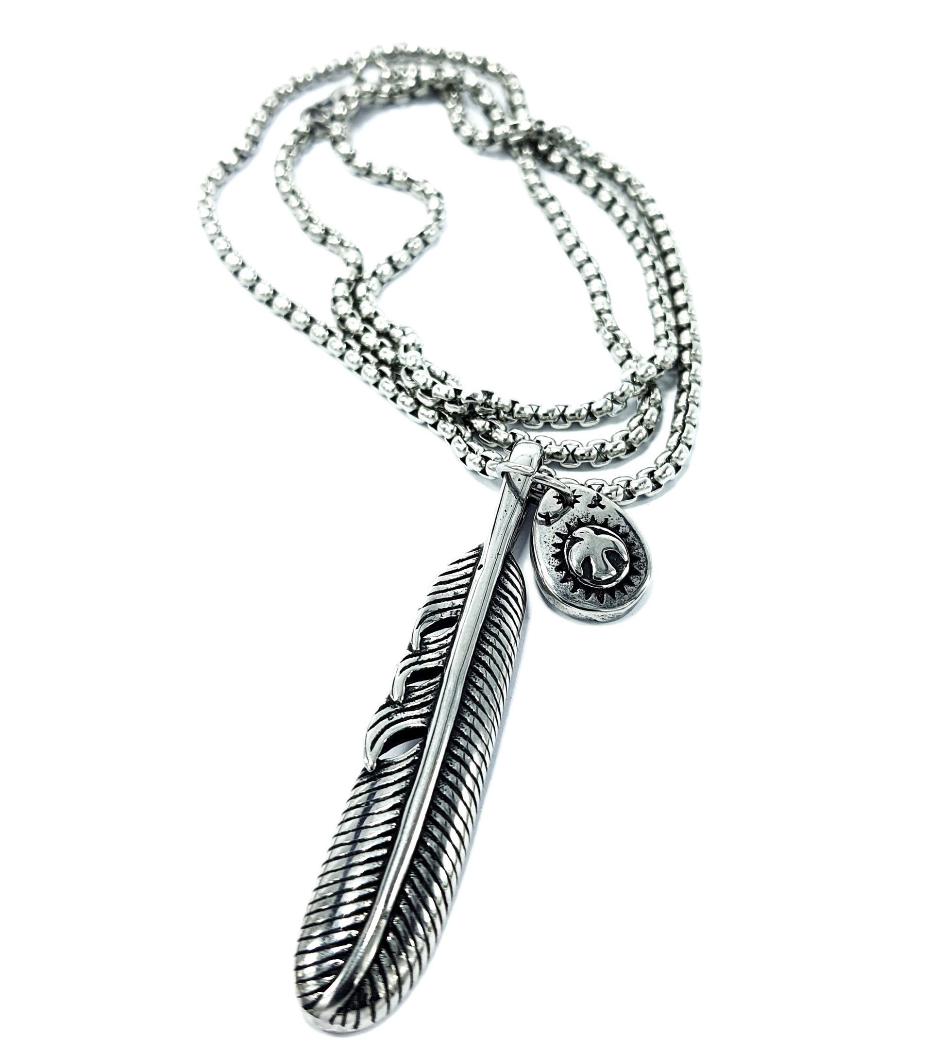 Mens Stainless Steel Box Chain Necklace with Feather and Eagle Pendants and Lobster Clasp.