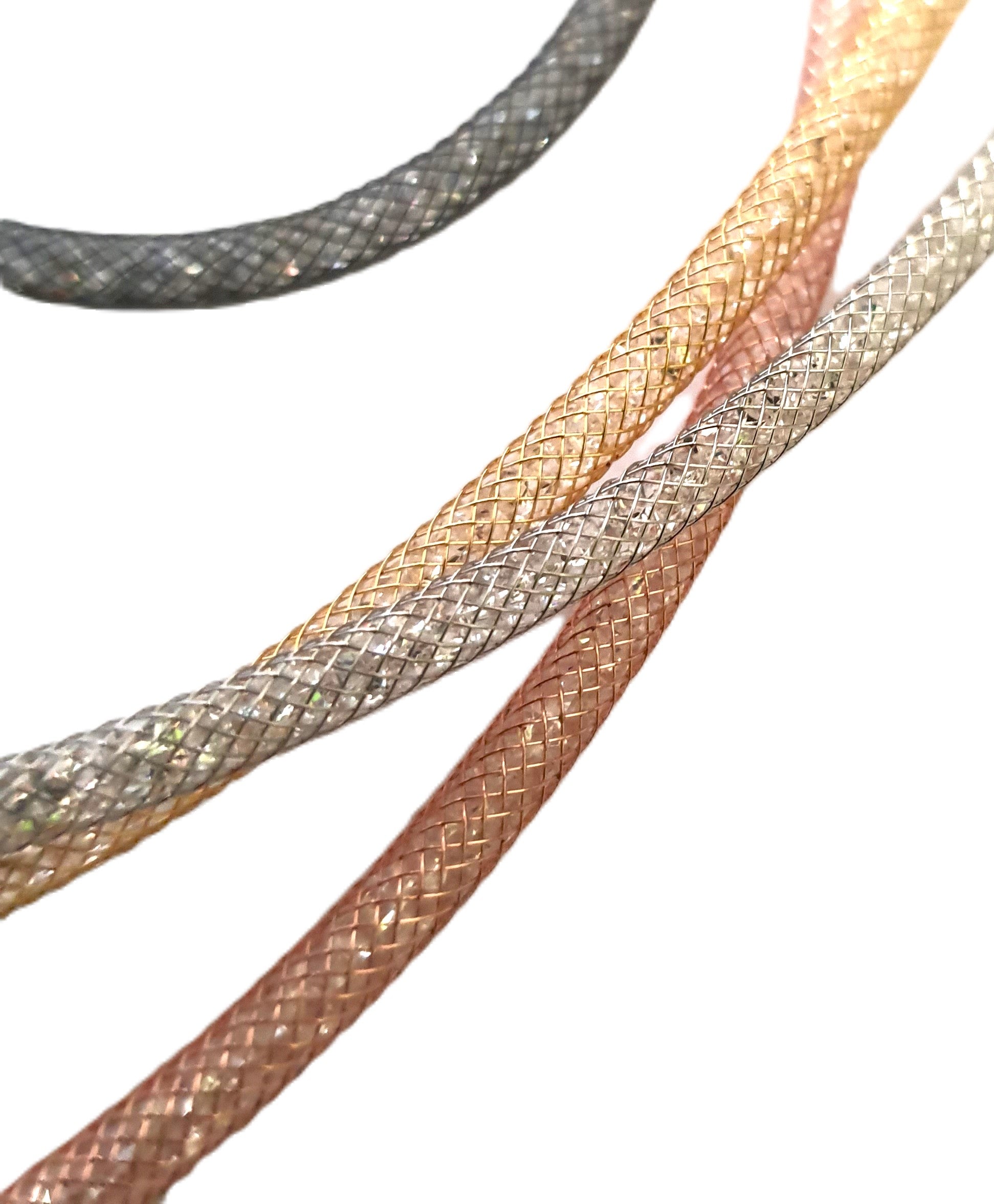 Swarovski Crystals shimmering like Stars on a meshed wire hollow tube Necklace. Available in Silver, Rose Gold, Gold and Black Diamond.